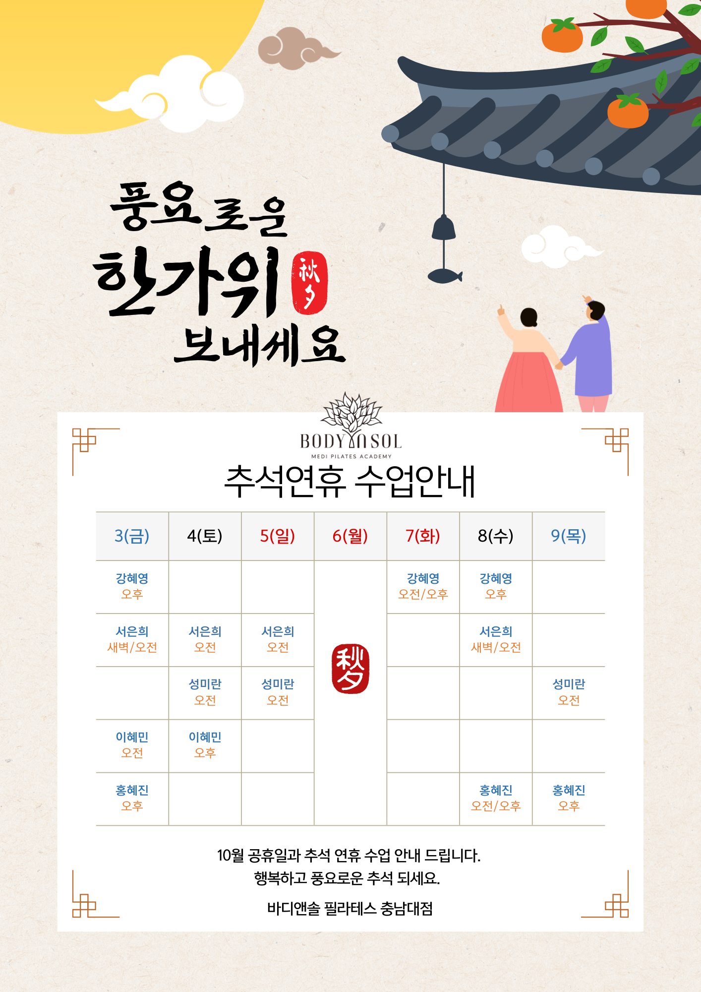[10월 연휴 및 추석 수업 안내] 풍요롭고 건강한 한가위 되세요