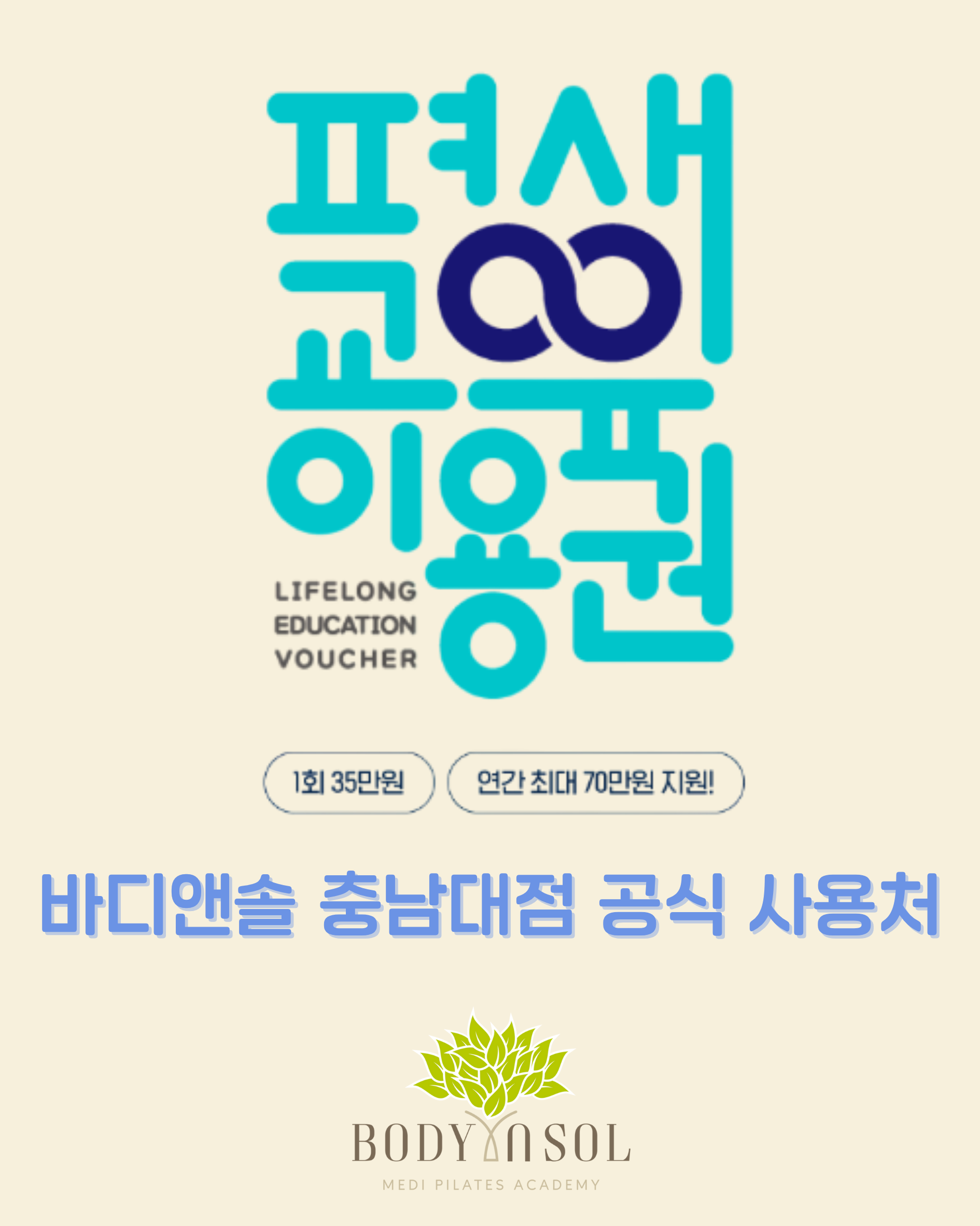회원님들의 더 건강한 삶과 배움의 기회를 응원하기 위해, 저희 바디앤솔 충남대점이 「평생교육이용권」 공식 사용기관으로 등록되었습니다!