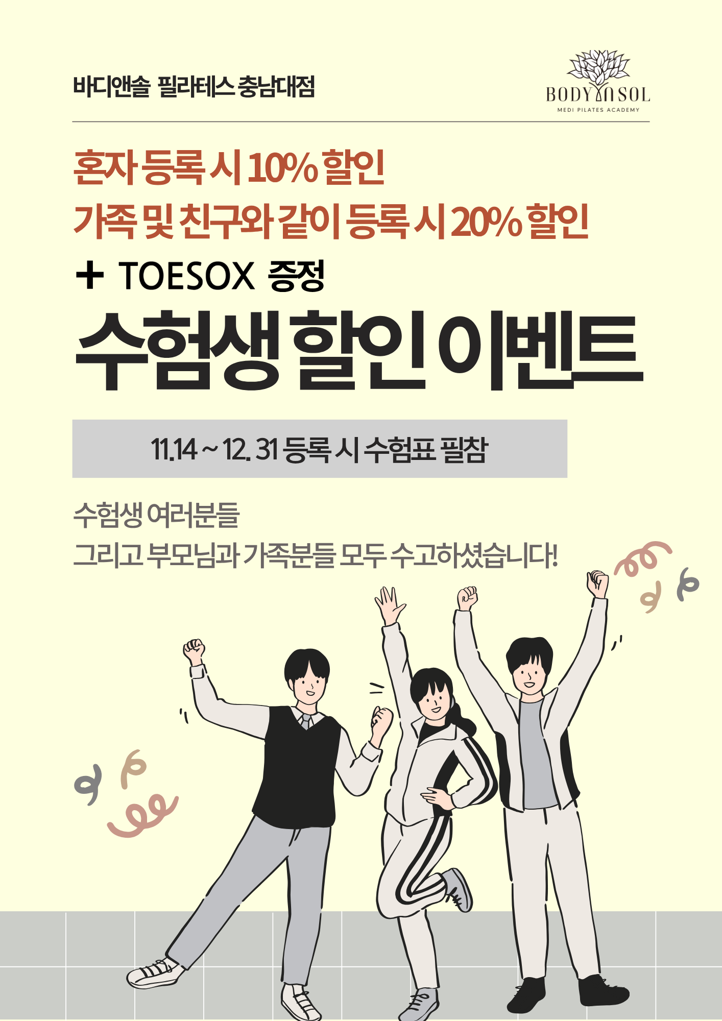 그리고 부모님과 가족분들 모두 수고하셨습니다! 긴장된 몸과 마음을 필라테스로 풀어보세요.